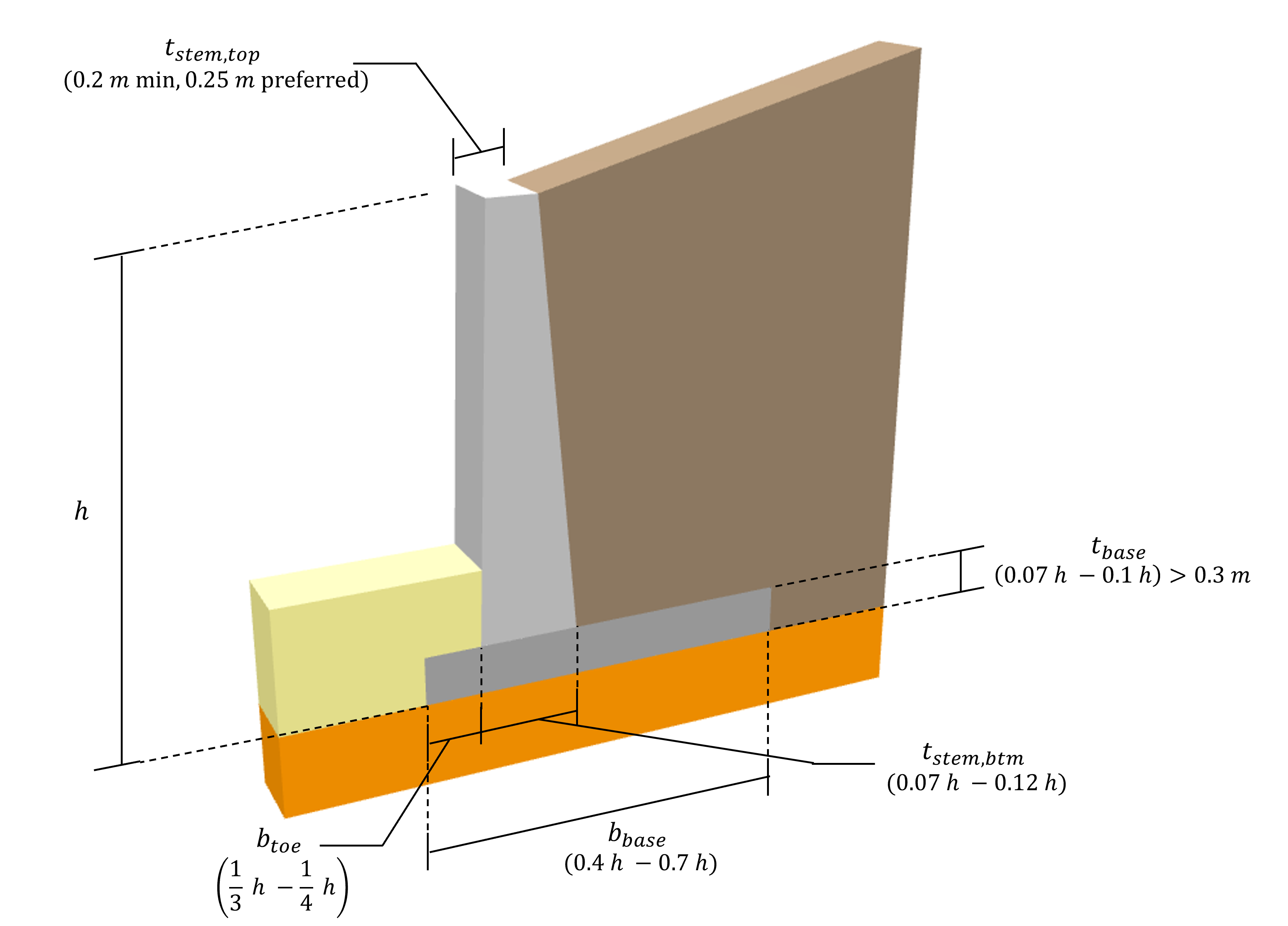 The first step before checking the retaining wall for stability is to assign preliminary dimensions to the different components of the retaining wall system, this is a very important stage in the design of a retaining wall since not assigning the right proportionate dimensions from the beginning to each component may lead to the need of iterating a lot to get the retaining wall to be compliant with the stability requirements or have an oversized system that complies all of the requirements but it using a lot more material than the theoretical minimum. The recommendations for dimensioning the retaining wall as per ACI are as follows: