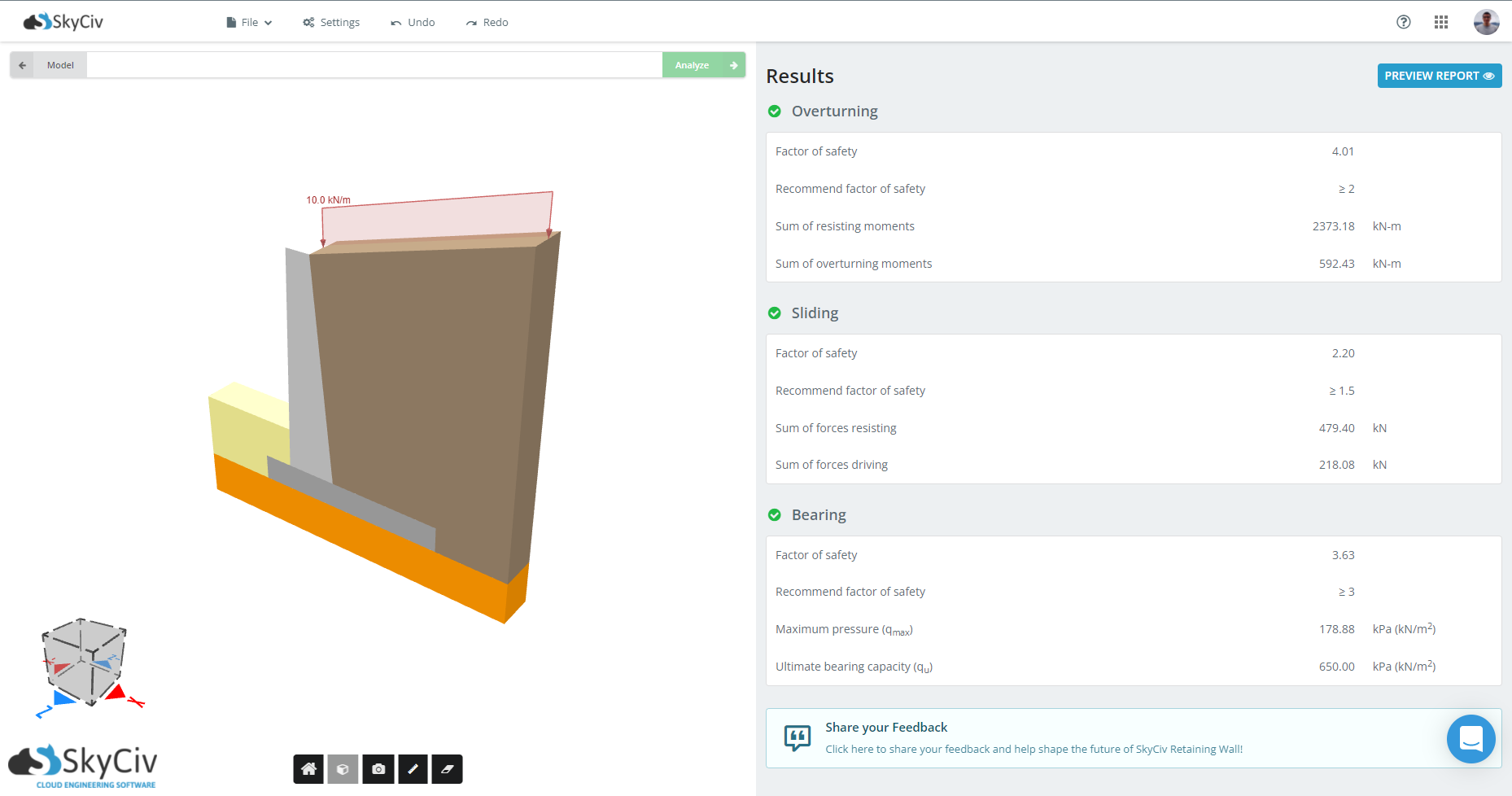 SkyCiv Retaining Wall Software helps engineers design Cantilever and Gravity retaining walls and is suitable for the calculation of block or concrete walls. The paid version also displays the full calculations, so you can see step by step, how to calculate the stability of a retaining wall against overturning, sliding, and bearing!