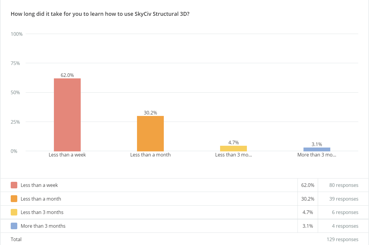 The SkyCiv team takes pride in the clean and user-friendly interface. Everything is clearly labeled and defined, so it’s not only easy to use but fast to learn. In fact, a one-hour demo can get you pretty far along the learning curve. Looking at a recent survey of 129 of our professional users, 62% of our users responded that the average time to learn SkyCiv S3D, was less than a week: