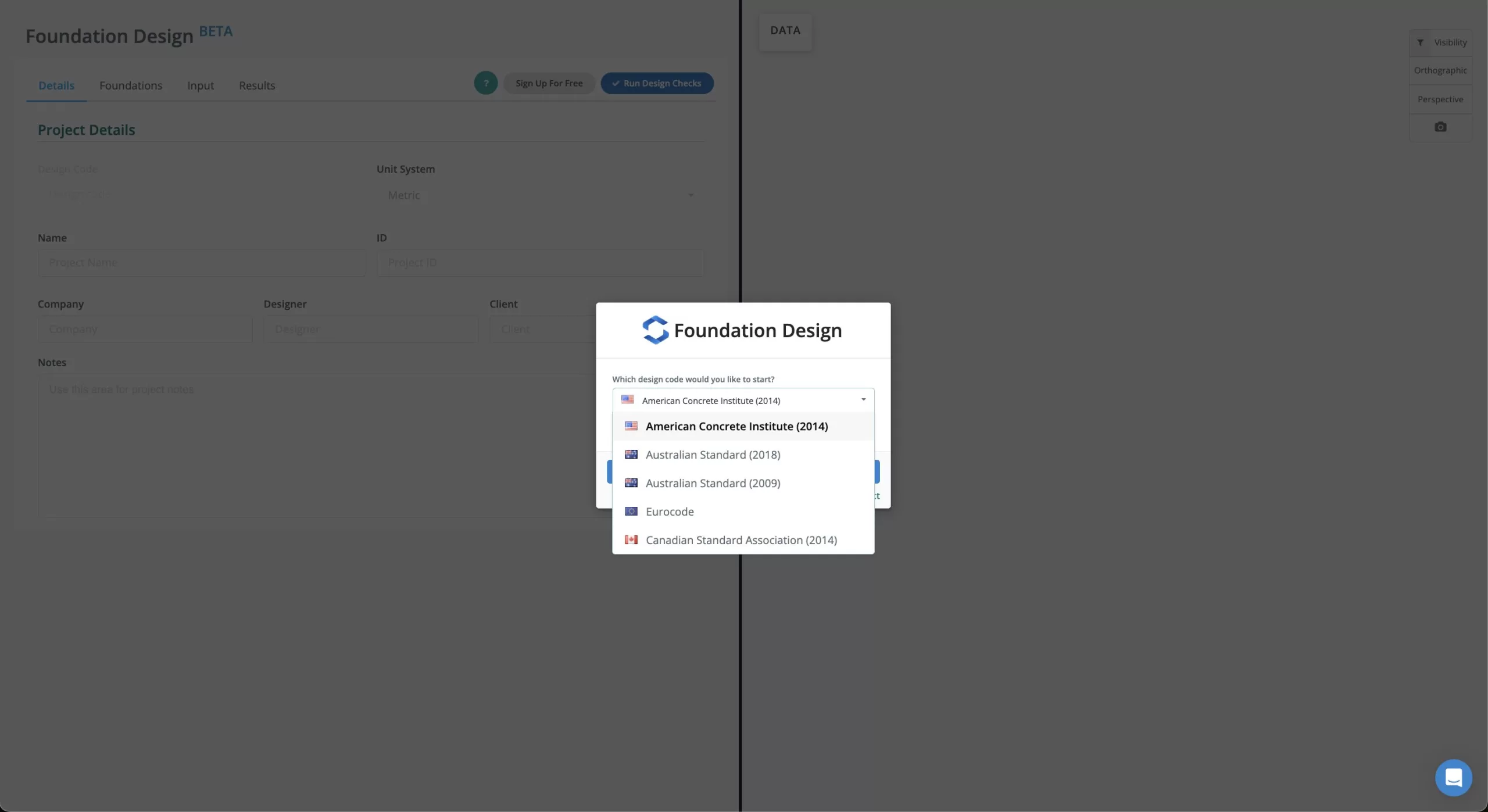 First select the relevant concrete design code you would like to design your footing with. Based on this selection, SkyCiv's Concrete Footing Calculator will help size your footing to meet relevant regional design considerations.