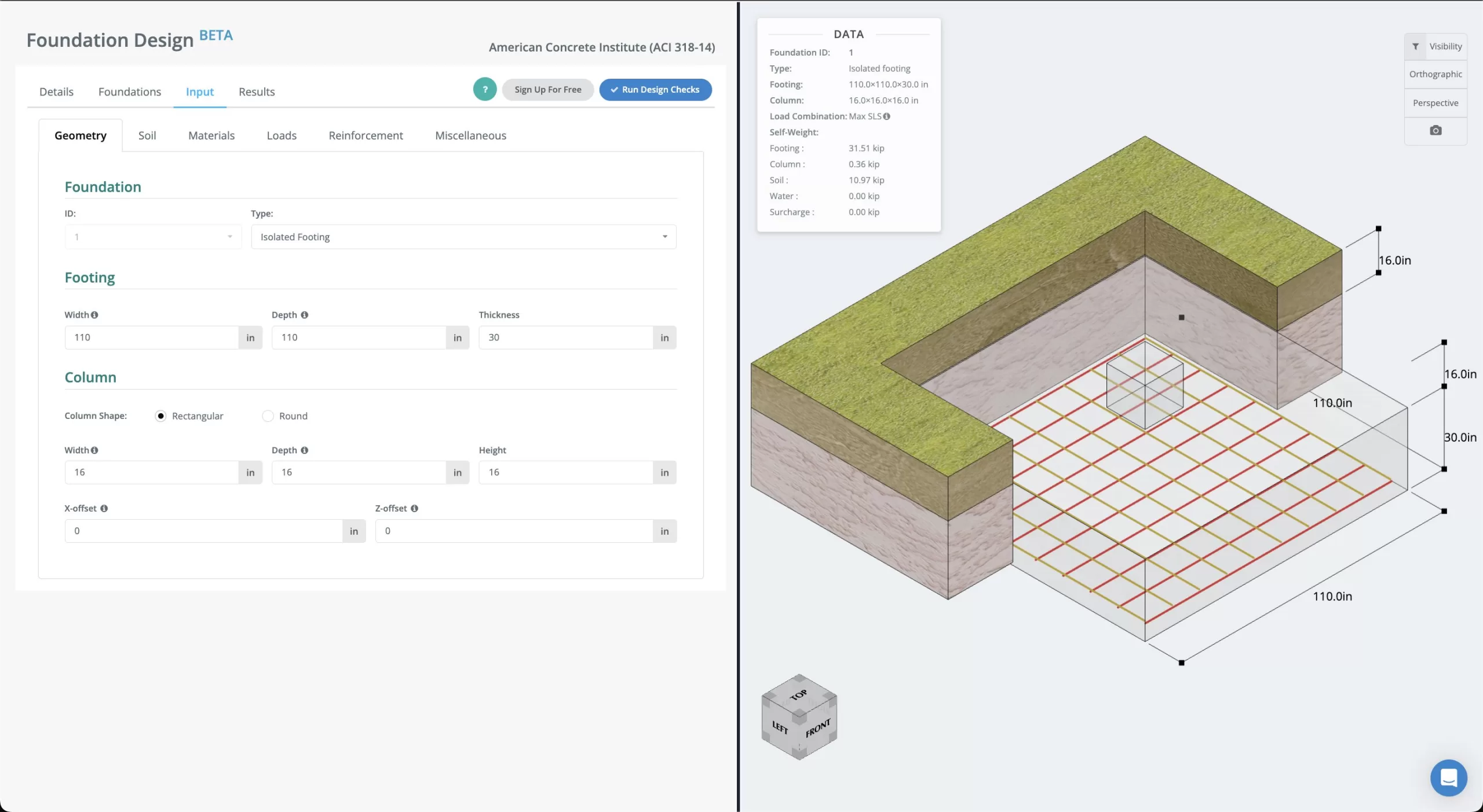 This online footing calculator is a simplified version of our Foundation/Footings Design Software, which is able to handle more loads and foundation types, including combined footings and non-symmetric isolated footings. Simply start by selecting your design code, and begin with adding or editing the dimensions of your footing via the width, height, and depth parameters. The figure will automatically update itself.