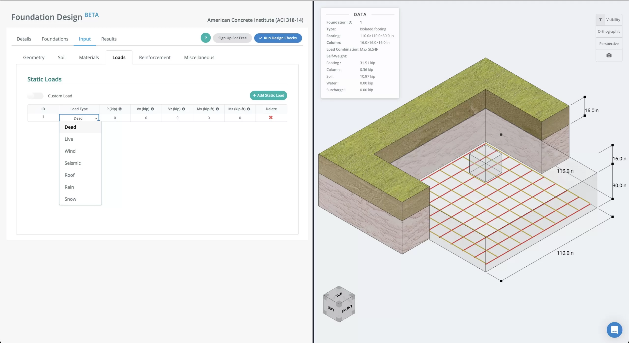 Next, you can input the loads of your footing (e.g. Dead, Live, Wind, Snow, etc.). SkyCiv's Free Concrete Footing Calculator also allows you to input custom ultimate and service loads as desired.