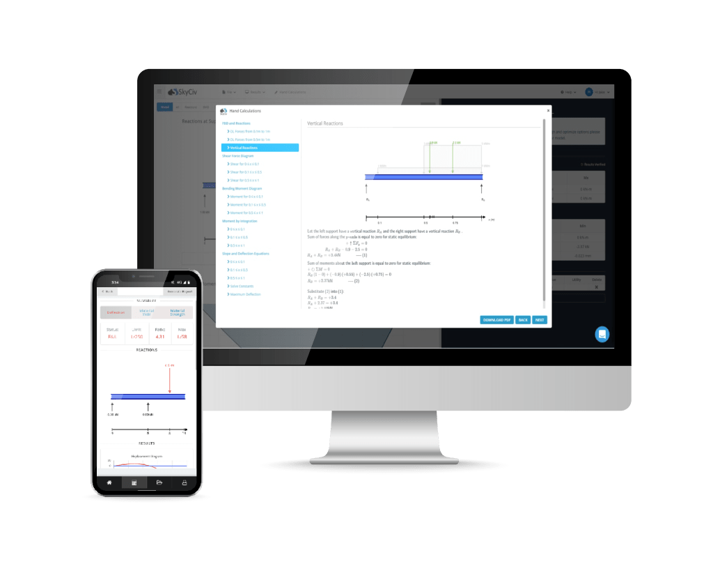 Access step-by-step hand calculations for beams, trusses, and sections with clear formulas and reasoning, helping you understand how each result is derived.